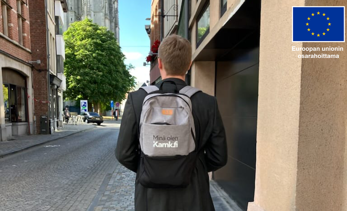 You may have seen me before. Grey fabric, sturdy straps, and bold letters declaring “Minä olen Kamk.fi”. I am not just any backpack – I am the KAMK backpack. But today, I will not just sit quietly on a chair or lean against a desk. Today, I will tell you the story of how I traveled with my companions from the InnoXR project and LINK Team to Belgium in May 2025.